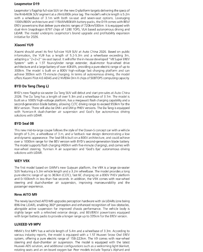 • 竞争加剧:大型电动 “9 系列” SUV 细分市场异常拥挤,包括蔚来 ES9、理想 L9 Livis、小鹏 GX、比亚迪 唐、长城 魏牌 V9X、零跑 D19 和 AITO 问界 M9 改款等。报告认为,其中只有少数车型能实现月销量突破 5,000 辆并维持六个月以上。