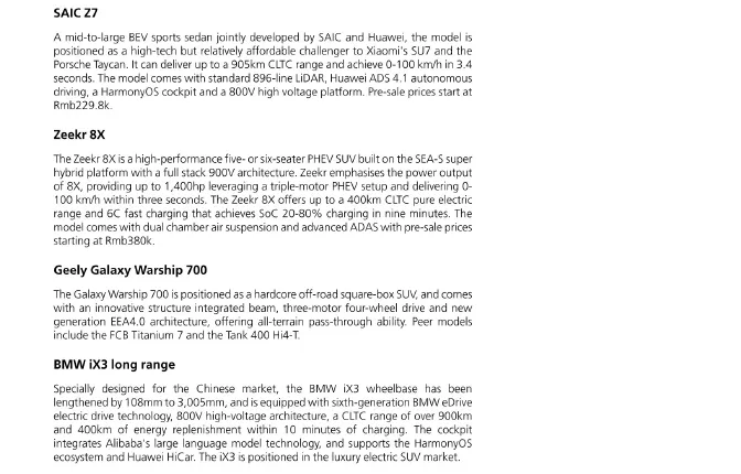 报告列举了多款值得关注的重点新车型及其关键特性: