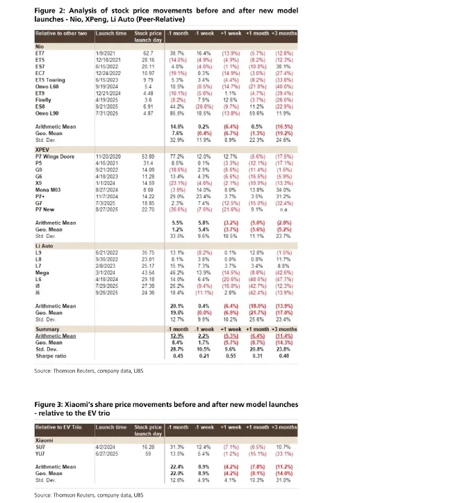 • 发布前:在新车型发布前一个月,股价平均表现优于同行约 7.6% 至 12.9% (几何平均值与算术平均值)。