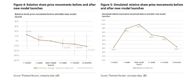 • 发布后:在新车型发布后一周和一个月,股价平均表现弱于同行约 5.7% 至 8.7% (几何平均值)。