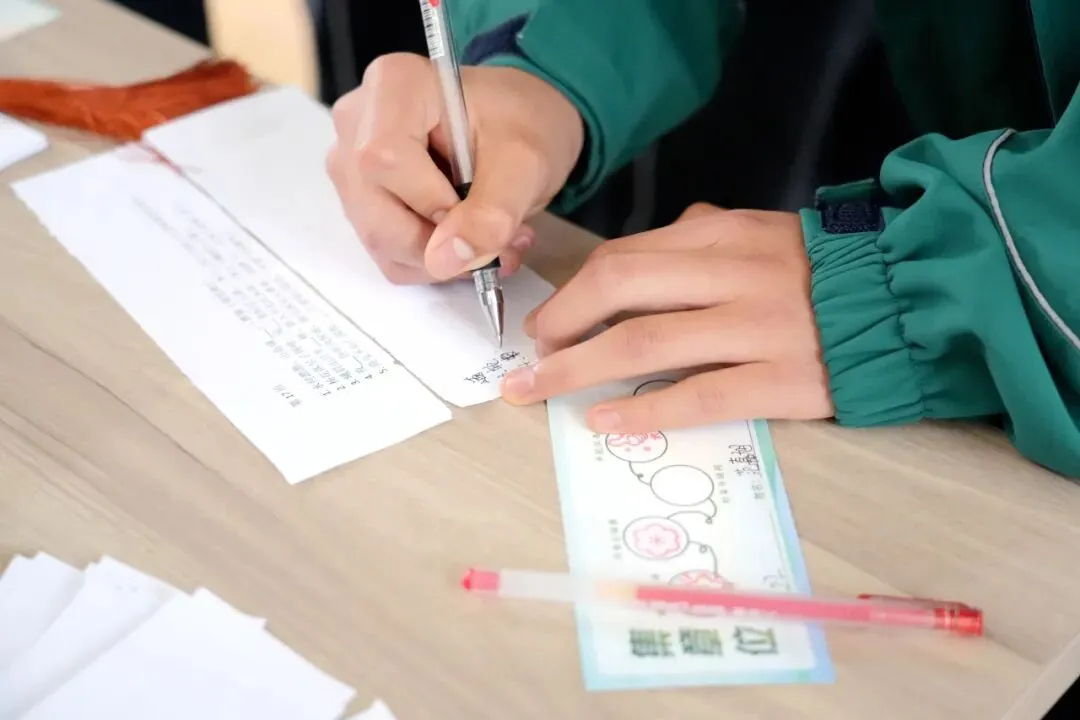 挖空填句,60秒内补全五句古诗。同学们笔走龙蛇,字迹工整,诗句完整,尽显书卷气质。