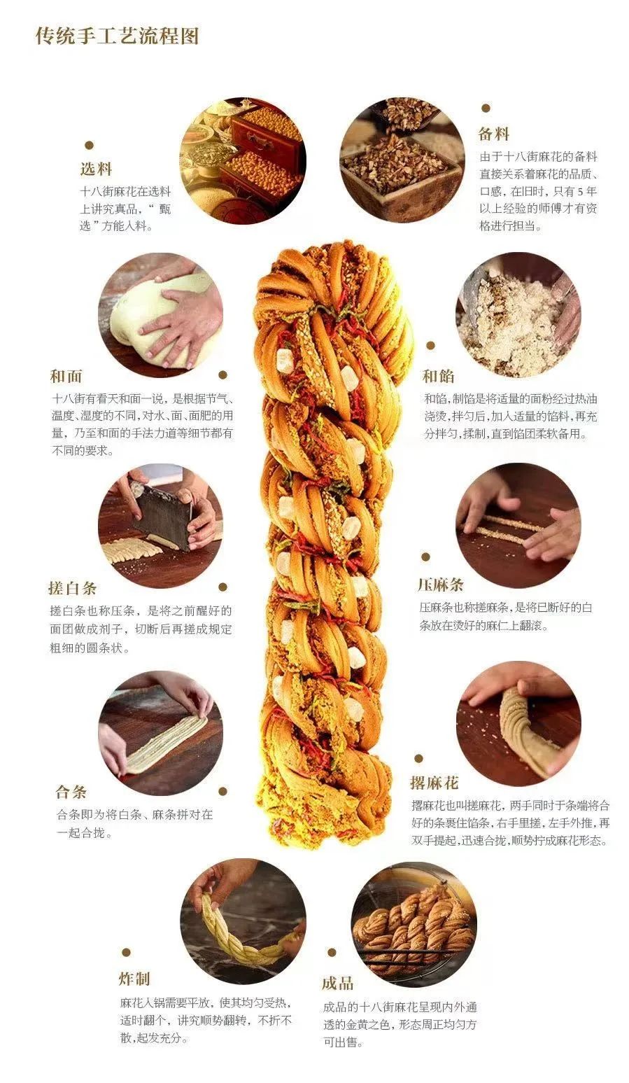 桂发祥十八街麻花诞生于1927年,当年在海河西侧的东楼村十八街处,有个精明利落的生意人刘老八,出身面点世家,深得祖上真传,身怀面点绝技,尤其他炸的麻花备受欢迎。初被人知便已渐露锋芒,津城民众对其频频光顾,喜爱有加,小铺字号被唤作“桂发祥”,因地处“十八街”,故而得名“十八街麻花”。自此“桂发祥十八街麻花”久负盛名。