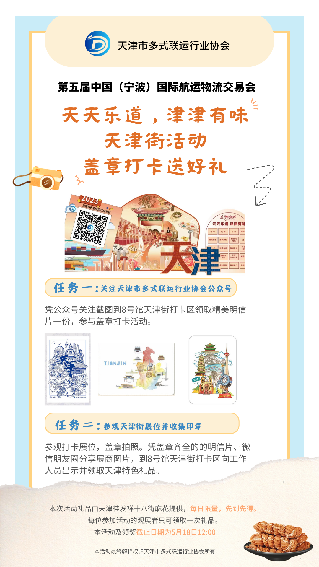 第五届中国(宁波)国际航运物流交易会将于2023年5月16日-18日在宁波国际会展中心7、8号馆盛大开启。为提升大家观展的活动性和参与感,天津市多式联运行业协会在本次展会上举办天津街盖章打卡活动。