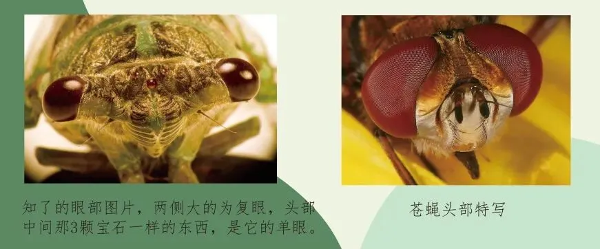 昆虫的眼睛有两种:单眼和复眼。单眼只可感受光线明暗,复眼由许多只透镜般的小眼组成,每一小眼的顶部都有一个角膜镜,下面是圆锥状的晶体,小眼越多,视力也就越强。
