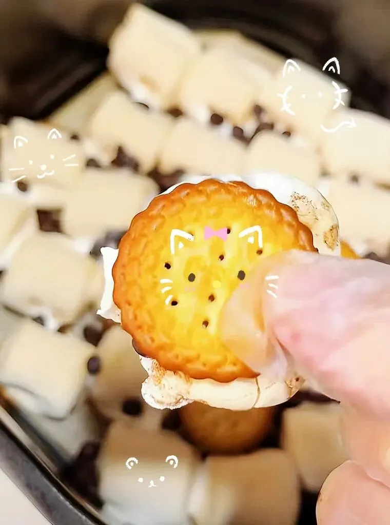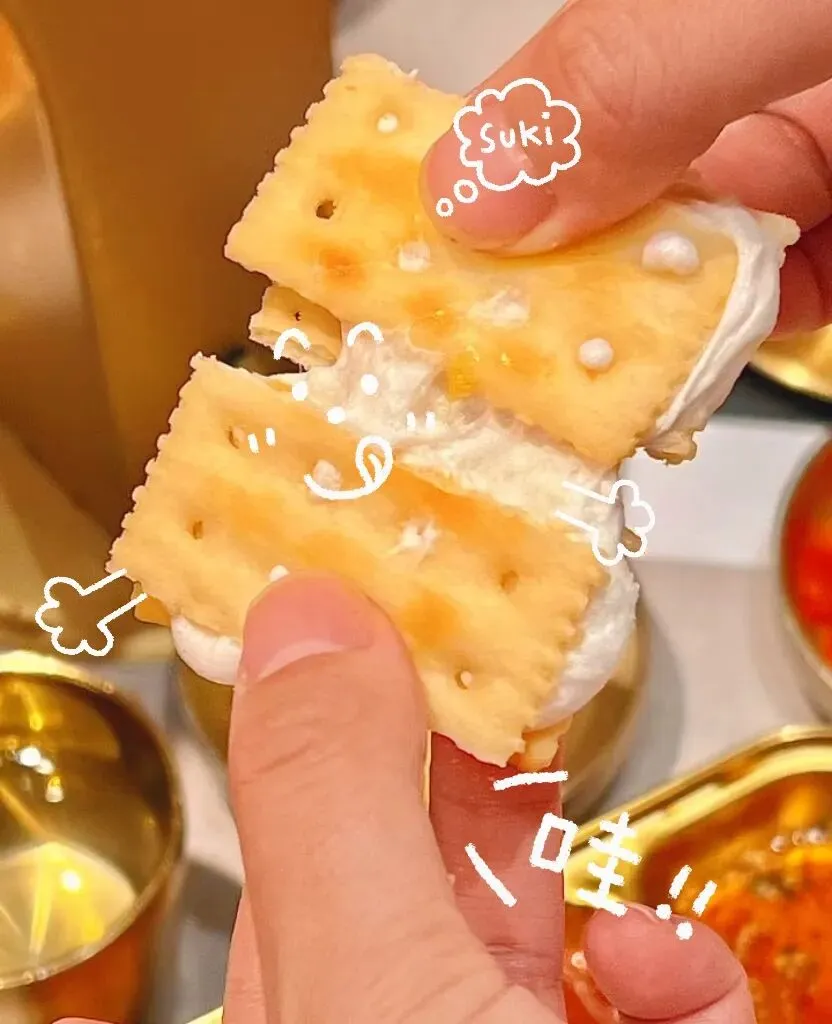 酥脆的苏打饼干,夹着软乎乎、糯叽叽的棉花糖,一口咬下去,是「咔嚓」的脆感和棉花糖的绵密在嘴里碰撞的双重快乐!甜度刚刚好,完全不腻口,一口一个,是属于春天的幸福感,逛展的时候随手拿一块,甜滋滋的超满足~