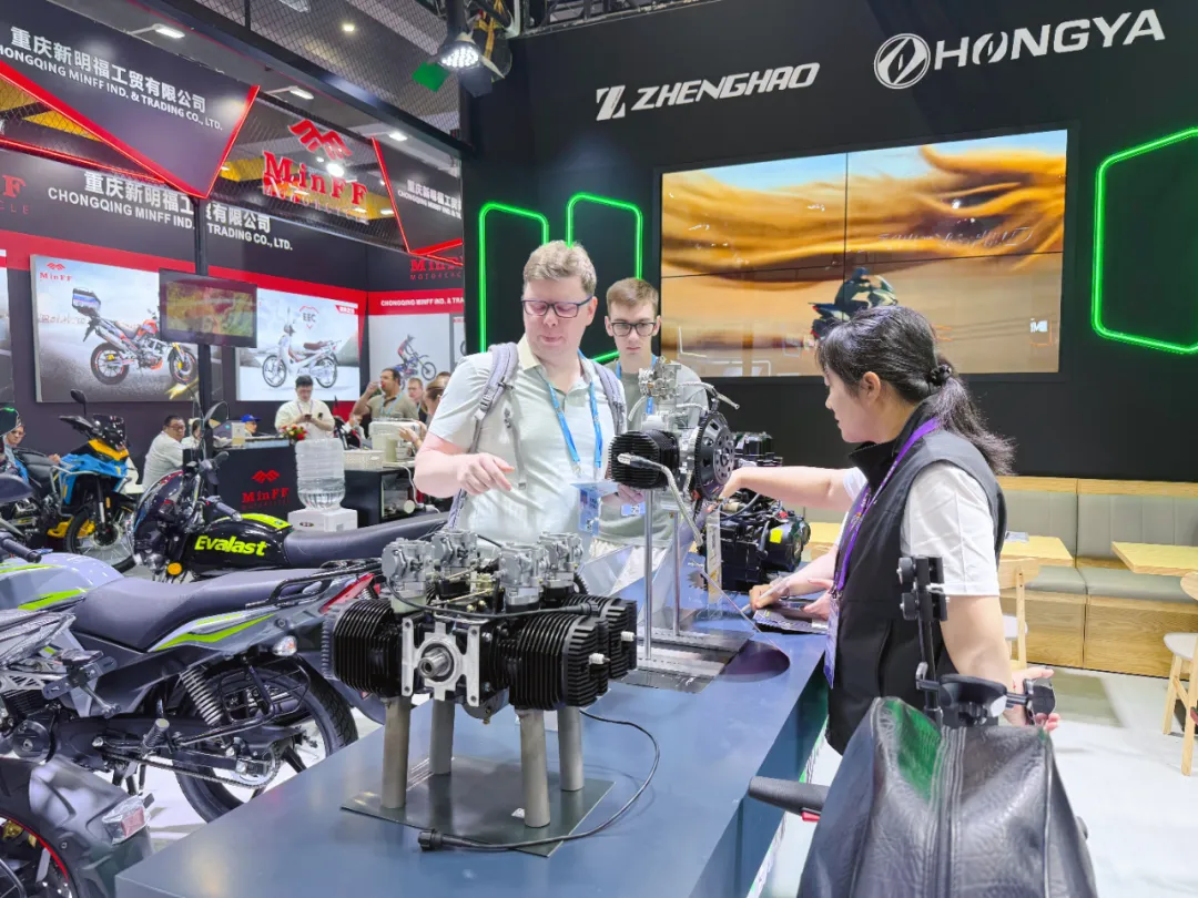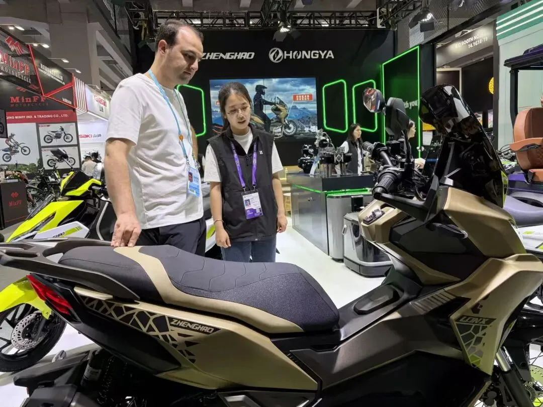 在正豪摩托展位,由江门本地设计研发的“龙行”踏板车融入中国元素,黄褐色车身搭配龙鳞纹样,采用形如手机的竖版 TFT 显示屏,凭借高颜值与高性价比,力争快速抢占全球市场。合作 6 年的土耳其客商 Qaderi 围着多款新品车型询问参数,对产品品质与创新能力赞不绝口。