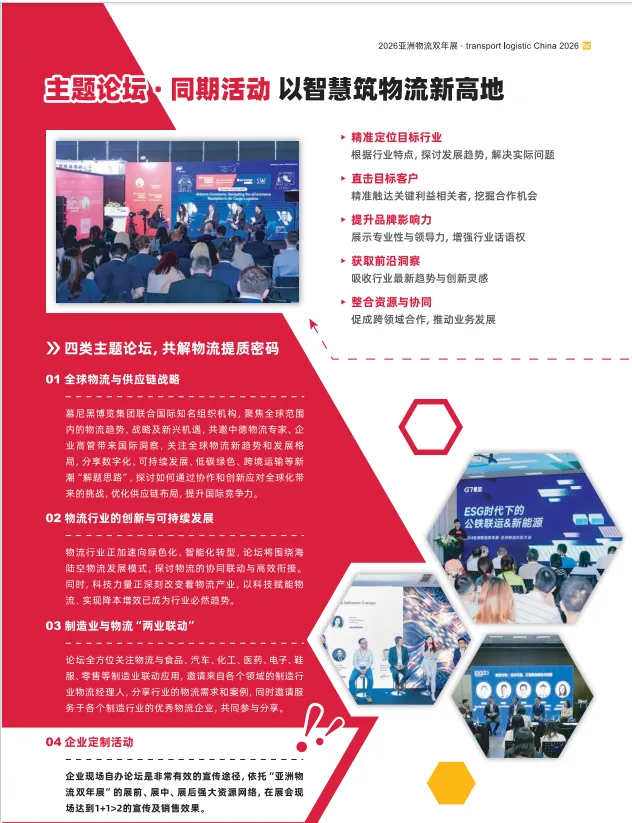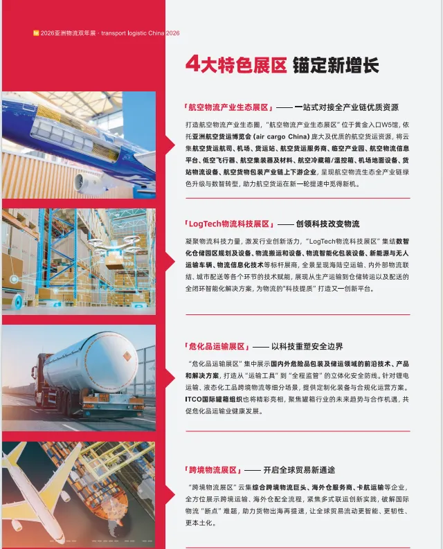 搏,聚焦海陆空物流“新发展”,呈现数智物流科技“新图景”,已然成为亚洲物流供应链行业旗舰大展。展会以“物流改变生活”为主题,聚合物流全产业链各端优质商贸资源,为企业品牌展示、交流合作、跨国贸易,以及产业创新升级、跨界融合提供一体化综合平台,向全球展现中国物流行业的优势实力与无限市场潜能,助力行业起航