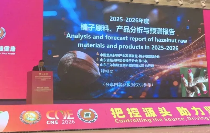 4月16日,山东三羊榛缘生物科技有限公司受邀出席展会核心论坛——坚果籽类原料产品分析预测发布会,总经理程相义发表“2025—2026年年度榛子原料、产品分析与预测”专题报告。