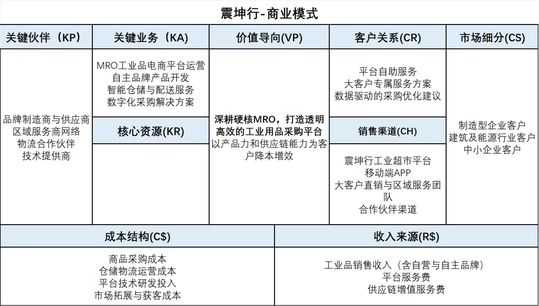 企业画像:京东工业是京东集团旗下专注于工业供应链技术与服务业务的子集团,2025年成功上市。公司致力于通过技术驱动实现工业供应链全链路的数智化,业务覆盖工业品采购、供应链管理、技术服务等全链条。2025年全年总收入达239.5亿元,同比增长17.4%。全年交易额达335亿元,同比增长16.5%。来自重点企业客户的交易额达165亿元,同比增长26.5%,服务重点企业客户数达1.33万家,同比增长26.0%;来自中小微客户的交易额达170亿元。落地案例:京东工业为制造业客户提供从需求识别到交付结算的一站式解决方案。针对中小微客户品类分散、比价困难、履约不稳定等痛点,京东工品汇和京东五金城两大平台依托高质价比的商品以及可靠的履约服务,打造了清晰的一站式采购入口。在出海服务方面,公司积极拓展供应链“伴随式出海”服务,为出海工业企业构建覆盖全周期、适配多场景的全球化服务体系。模式特色:京东工业以“技术+平台+供应链”三位一体为核心竞争力。其商业模式的核心在于通过全链路数智化打通供需两端,将京东集团在电商和物流领域的能力积累迁移至工业品领域,实现从“交易平台”向“供应链协同平台”的升级。平台型模式使其具备强大的规模效应和网络效应。2.震坤行:硬核MRO平台+自主品牌双轮驱动