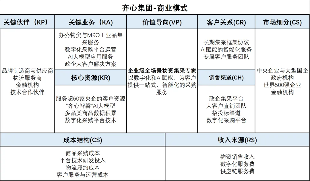 企业画像:齐心集团(002301.SZ)是深交所A股上市企业,长期致力于企业级全场景物资集采服务,是中国B2B政企数字化集采服务领域的龙头企业。在深耕办公行政物资业务的基础上,公司积极拓展MRO工业品等高附加值业务场景。2025年上半年,公司实现营业收入47.73亿元,归母净利润8749.30万元,经营活动现金流量净额达1.2亿元。公司累计上线AI应用场景近70个,通过AI应用助力降本增效。落地案例:齐心集团于2025年初推出“齐心智磐”AI大模型,覆盖商品寻源与上架、客户点单、订单分配、供应链结算、履约配送等数字化采购全链路环节,实现了对供应链全流程的端到端在线化、自动化和智能化管理。当前公司已服务100家央企中超过60家,在MRO工业品领域的业务拓展正在加速推进。模式特色:齐心集团的独特优势在于“政企集采深耕+AI技术赋能”的双轮驱动。公司以办公物资集采为基本盘,依托长期服务央企的客户资源和品牌信任,逐步向MRO工业品领域横向延伸。其“齐心智磐”AI大模型覆盖采购全链路,体现了从传统集采服务商向数智化供应链服务商的战略转型。(三)商业模式创新路径总结