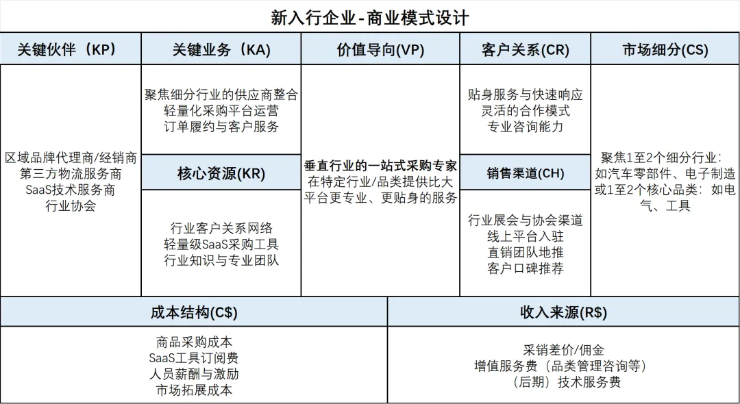 对于新入行企业而言,最大的挑战在于资源有限、品牌空白、供应商资源不足。建议聚焦1至2个细分行业或品类建立差异化竞争力。可以选择的切入路径包括:聚焦特定制造业门类的生产性物料供应(如汽车零部件、电子元器件),或聚焦特定MRO品类的一站式采购服务(如劳保用品、工具耗材)。- 赛道选择:优先选择自身具备行业认知或客户资源的制造业门类,集中资源做深做透。或者优先切入标准化程度较高、品牌集中度较低的品类(如劳保用品、工具、紧固件等),逐步扩展。
