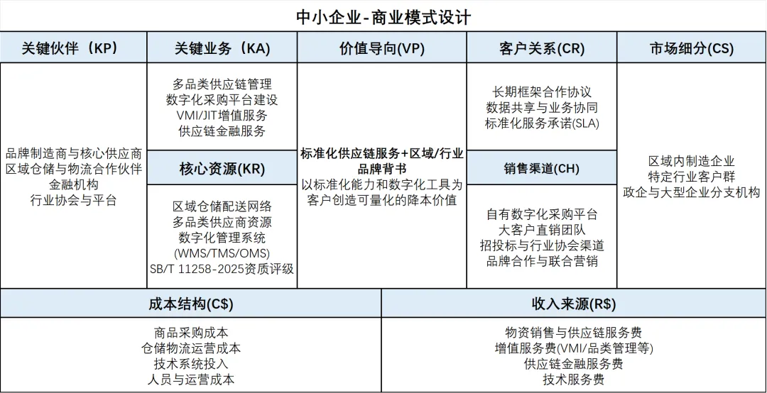 对于已具备一定业务基础的中小型工业品供应链企业,发展的关键在于从“贸易商”向“服务商”转型,从“卖产品”向“卖能力”升级。- 标准化先行:对标SB/T11258-2025的4A级评估指标,系统提升“四流”服务能力,争取获得评级认证。