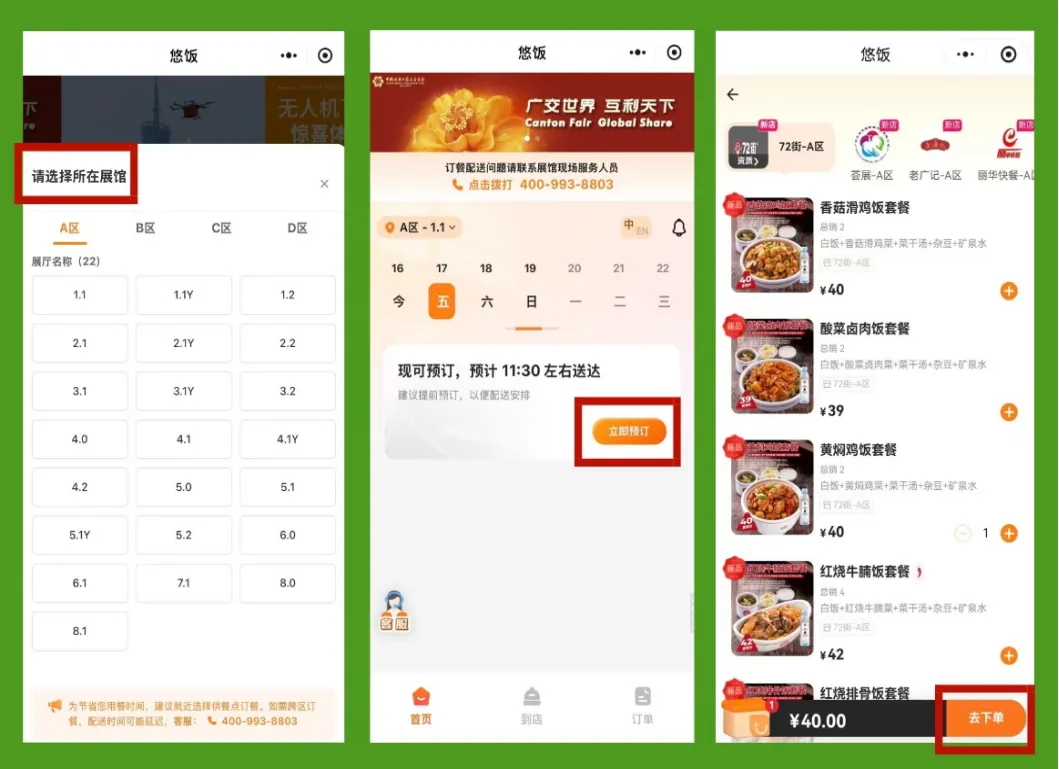 选择展馆→选择送餐时段→挑选菜品