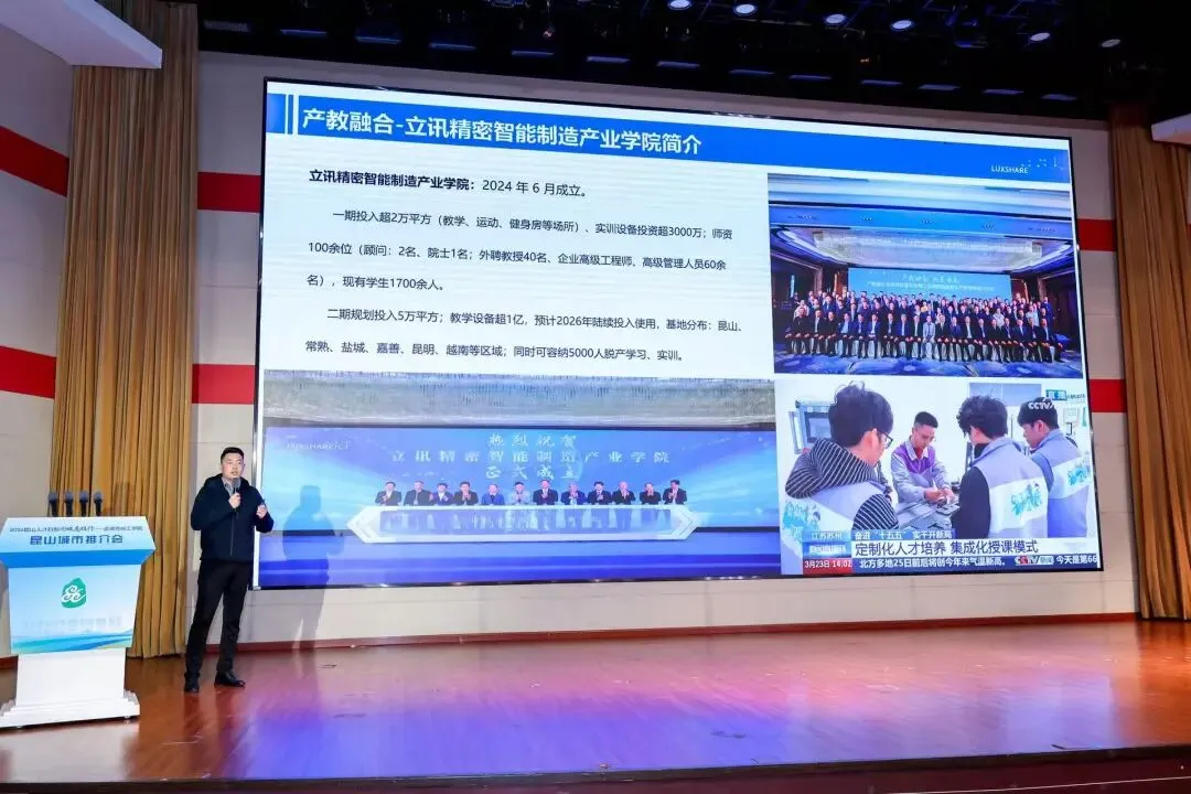 立讯精密智能制造产业学院昆山基地主管苗欣代表立讯集团面向广大师生展示立讯集团发展历程、产业布局与立讯产业学院建设成果。他表示,立讯精密智能制造产业学院是立讯集团与高校强强联合共建的新型产业学院。学院内所有设备和技术均与真实生产设备同步,不会出现课堂所学与实际应用脱节的情况。企业根据自身实际技能需要设计课程,同时组建由高校资深教授与企业高级工程师构成的双师教学团队。学员完成学习和考核后即可入职上岗,让产业与就业协同联动。