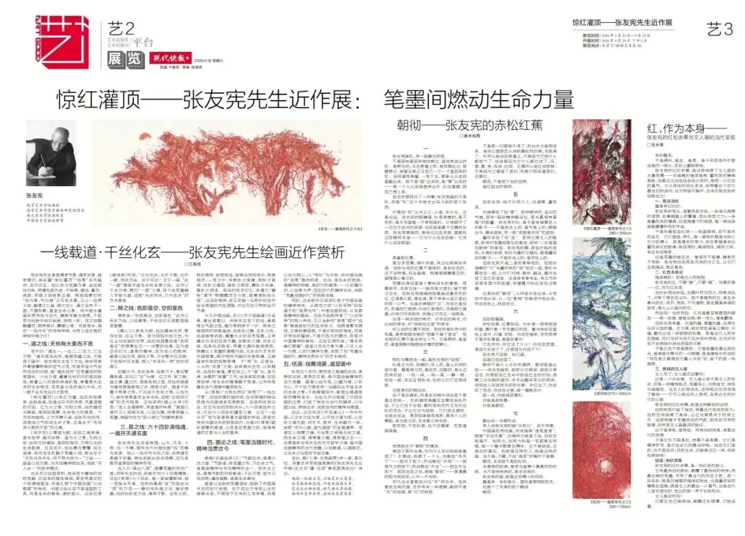张友宪先生身具儒者气象、道家风骨、释家襟怀,其彩墨“惊红灌顶”“线象”系列画作,足可印证。他以东方笔墨为骨、金丝银线为脉、斑斓色韵为血,于抽离、缠结、叠加、涡旋、炸裂之间破象立道。既承鸿蒙初判“线为骨、气为魂”之天地本真,又以一线贯千劫,融儒之仁爱、释之空心、道之自然于一画,不囿形骸,直呈生命心象。将中国水墨画纵贯传统与当代,横跨写意与抽象,于哲思与创新中别开新面、独树一帜。观之如醍醐灌顶,眼界顿开,震撼心魂。究其根本,俱在“一线开天”的传神写照,与夸父追日般的神性呼唤之中!