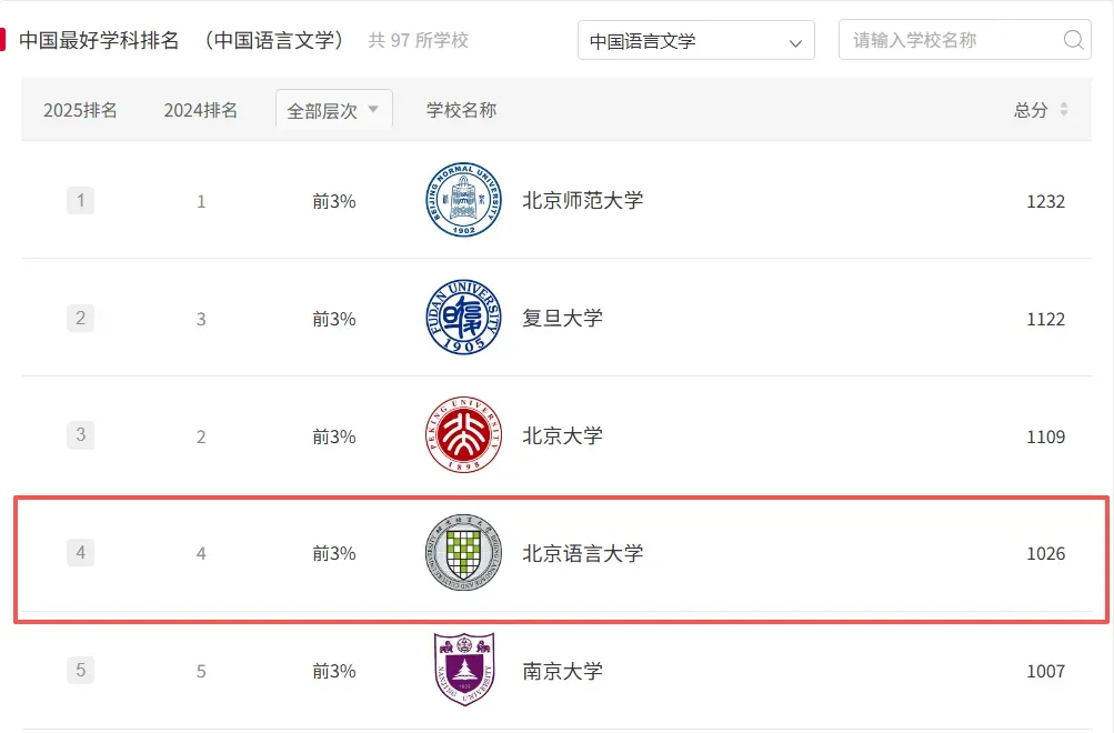 北京语言大学的中国语言文学于2006年获批中国语言文学一级学科博士点,在2024年软科学科排名中综合实力位列全国第四名,为全国前3%。