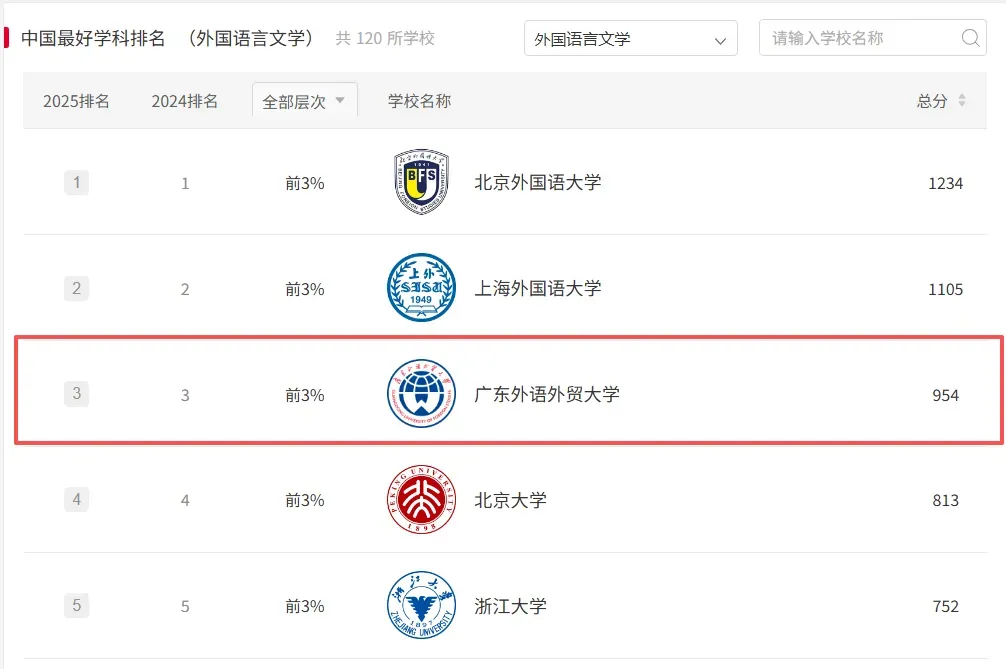在教育部学位与研究生教育发展中心组织开展的几轮学科评估中,外国语言文学学科均位居全国高校前列,连续五年上榜软科“中国顶尖学科”。