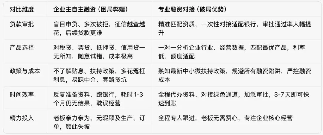 中小微企业融资难,归根结底是企业主不懂银行规则、盲目申贷、缺乏专业规划所致。多数老板忙于经营,无暇钻研融资政策,盲目挑选贷款产品,反复申请导致征信受损,不仅拿不到合适资金,还容易踩中高息、套路贷等陷阱,白白耗费时间与金钱,甚至错失企业发展良机。