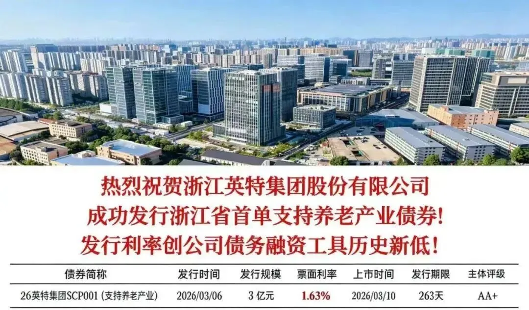 2026年3月,上市公司英特集团发行2026年第一期超短期融资券(支持养老产业),该笔债券为浙江省“首单”支持养老产业的债务融资工具,发行金额3亿元、发行利率1.63%、发行期限263天。由浦发银行杭州分行担任联席主承销商。这笔债券的票面利率仅为1.63%,远低于一般企业贷款成本。
