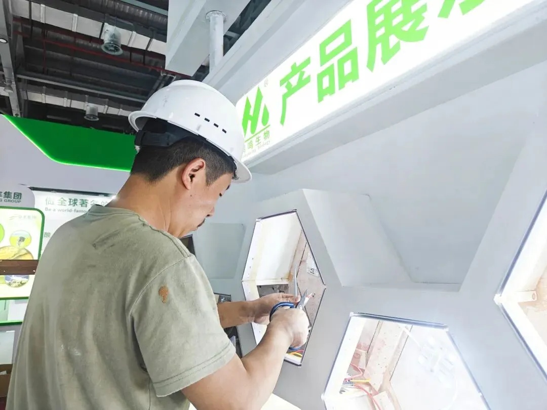 主体结构选用高强度金属太空架与防火板材,兼具稳固性与安全性,完全符合大型展会的承重与安全标准;灯箱画面采用高清喷绘工艺,色彩还原度高、文字印刷清晰,全面提升展位的整体质感;电路布置采用隐蔽式布线方式,配备漏电保护、过载保护等多重防护装置,满足照明、电脑、宣传屏等各类设备的稳定用电需求,从根源上保障安全。同时,最大限度减少现场焊接与物料浪费,在打造高品质展位的同时,兼顾生态环保。