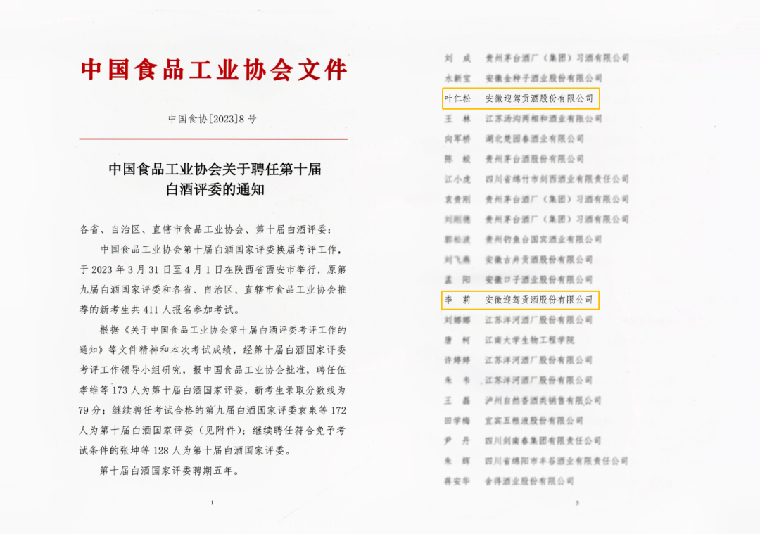 3月31日至4月1日,中国食品工业协会第十届白酒国家评委换届考评工作在陕西西安举行。会上新聘任了173人为第十届白酒国家评委,其中,安徽迎驾贡酒股份有限公司申报的叶仁松、李莉2人成功入选。