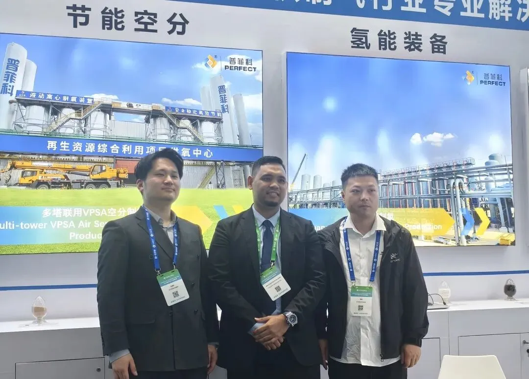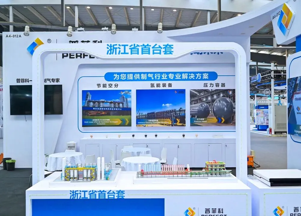普菲科展位位于A4-012A,此次带来了氢能科技、节能空分、压力容器、低温装备以及新材料系列产品,重点展出22000m3/h液动离心制氧和35000m3/h多塔多段甲醇制氢两个浙江省首台套产品1:50的模型,引得不少国内外客商驻足、咨询。该两款设备与国内同类运行装置相比具有能耗低、甲醇消耗小等优点,节能及经济效果明显等优势,已成功配套于国内化工巨头。