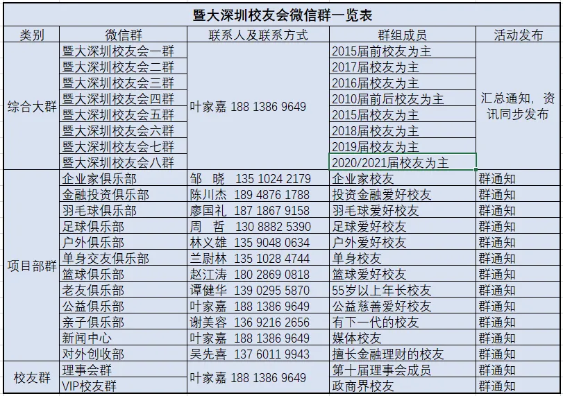 微信群:综合一、二、三、四、五、六、七、八群、VIP群、理事群;俱乐部(10个):羽球、篮球、足球、户外、单身交友、投资金融、校友企业家、老友、亲子、公益。
