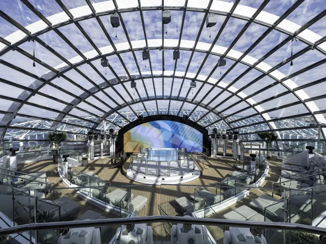 这艘穹顶高25米、宽50米,是迄今整体吊装至邮轮的最大部件。内部将容纳水上剧院、55英尺瀑布和夜生活空间。