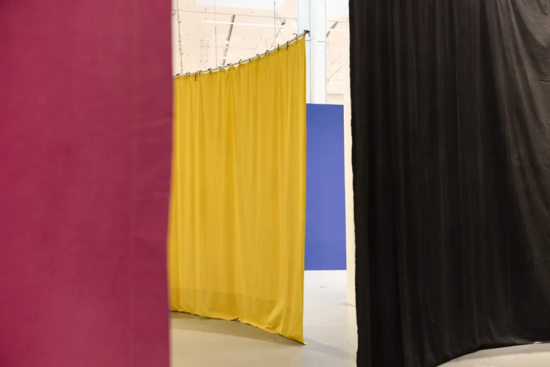 穿行于这片色彩剧场,七幅巨型手绘织物从天花垂落,层层叠叠。它们最高近五米,最宽达十五米,如同剧院里的侧幕与景片,既划分空间,也遮蔽视线。
