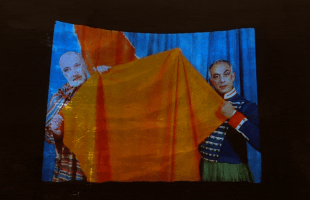 三幅由十六毫米胶片转录的彩色无声影像,在幕布间隙静静流淌。《窗如橙子般打开》的画面带着超现实的虚幻质地,影像与织物、光影交织在一起,在幕布之中再造了一个微型的剧场。而另一处,质感的黑白默片以沉静、神秘、充满仪式感的画面,致敬百年前的剧场美学。