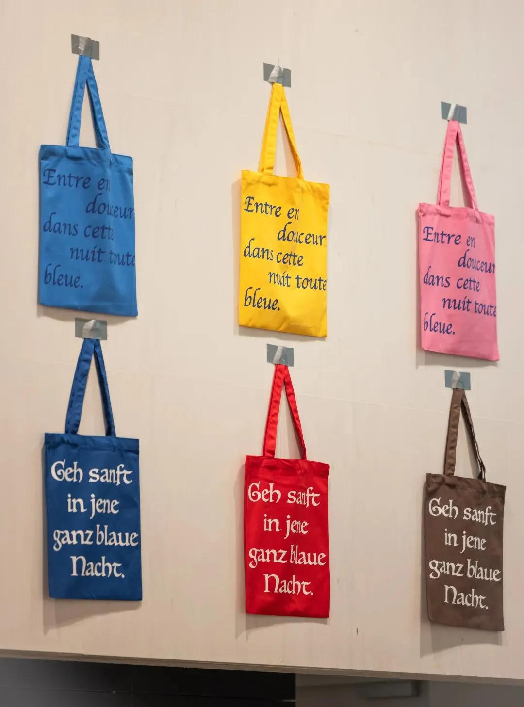 《温柔地步入蓝色戏法的良夜》展览现场,糖果、被子、太阳(SWEETS, QUILTS, SUN),2018,绘制织物,6件(每件):350 × 1000 cm。 ©设计互联