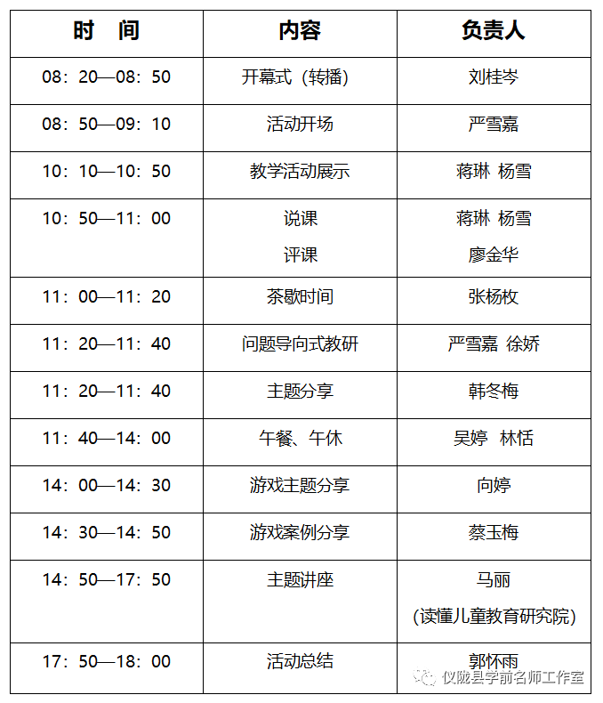 莅临本次活动的领导和专家有:县教科体局副局长唐栋宇,县教科体局教育股股长李斌忠,县教科体局教育股幼教专干郭怀雨,县教科体局深改办刘治文,县教师进修学校肖霞,城南教育督导组蒋理,县名园长工作室领衔人廖金华,读懂儿童教育研究院讲师马丽。