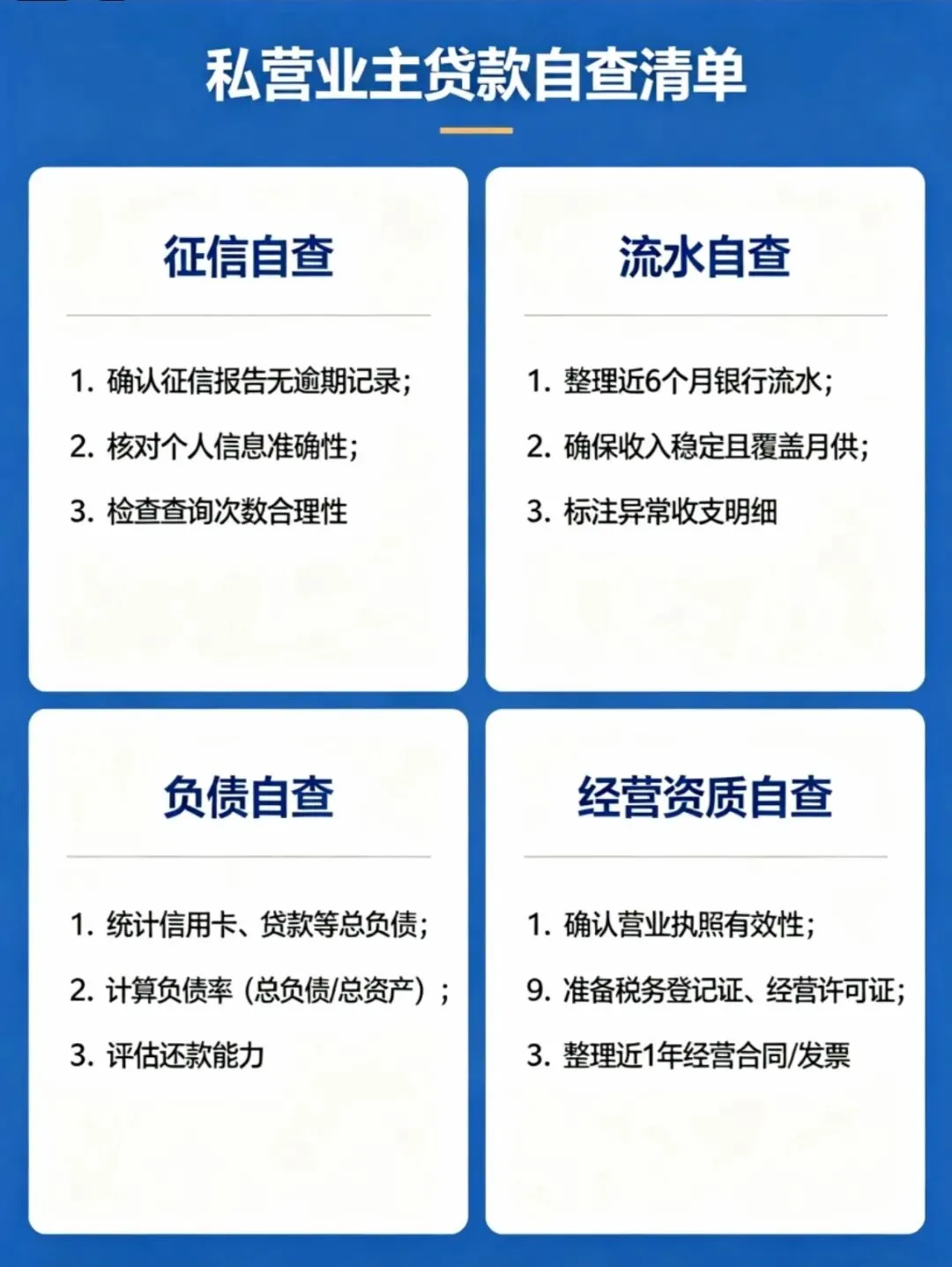 今天整理了私营企业主贷款被拒的4大核心坑,附带超全自查清单,看完对照自查,避开雷区,一次性提高贷款通过率!