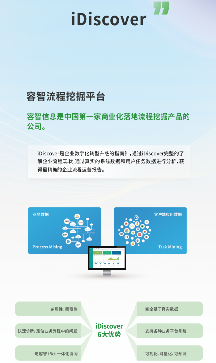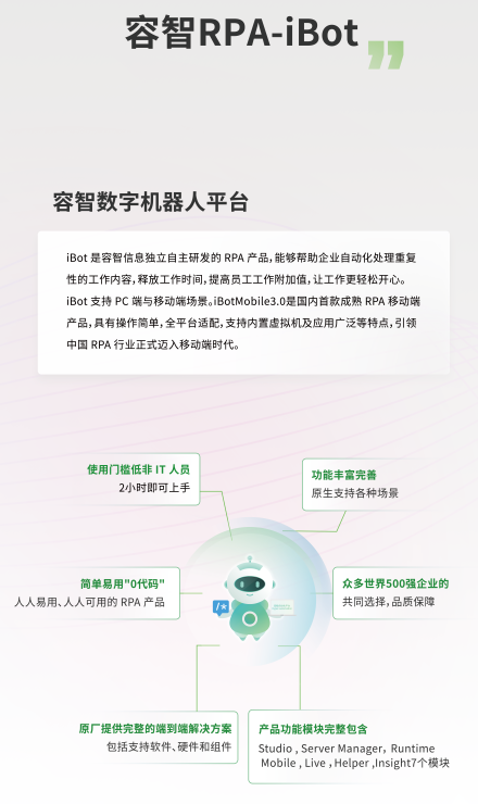 容智信息以核心RPA产品容智iBot、流程挖掘iDiscover和AI产品AI-Lab为技术底座的产品矩阵,打造端到端全生命周期容智超级自动化平台(HAP),重新定义人与机器人的工作职责,帮助企业实现数字化转型升级。