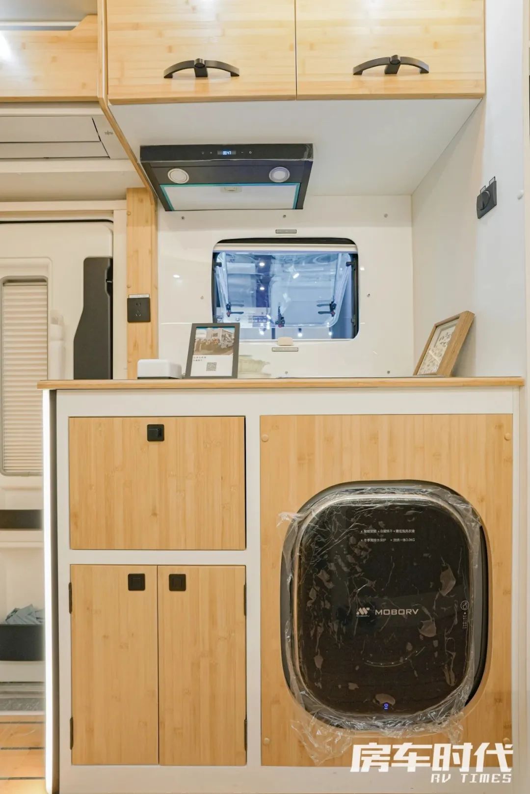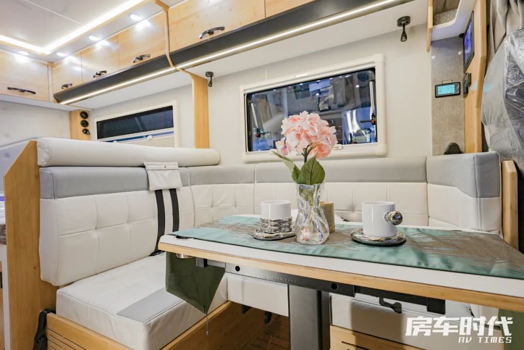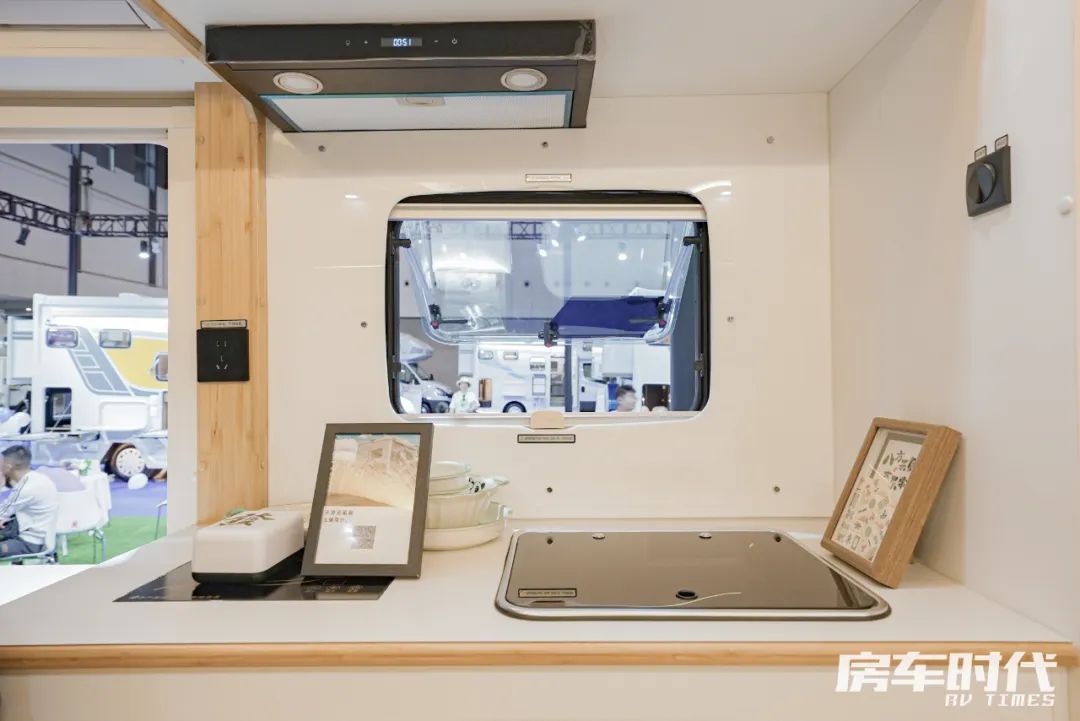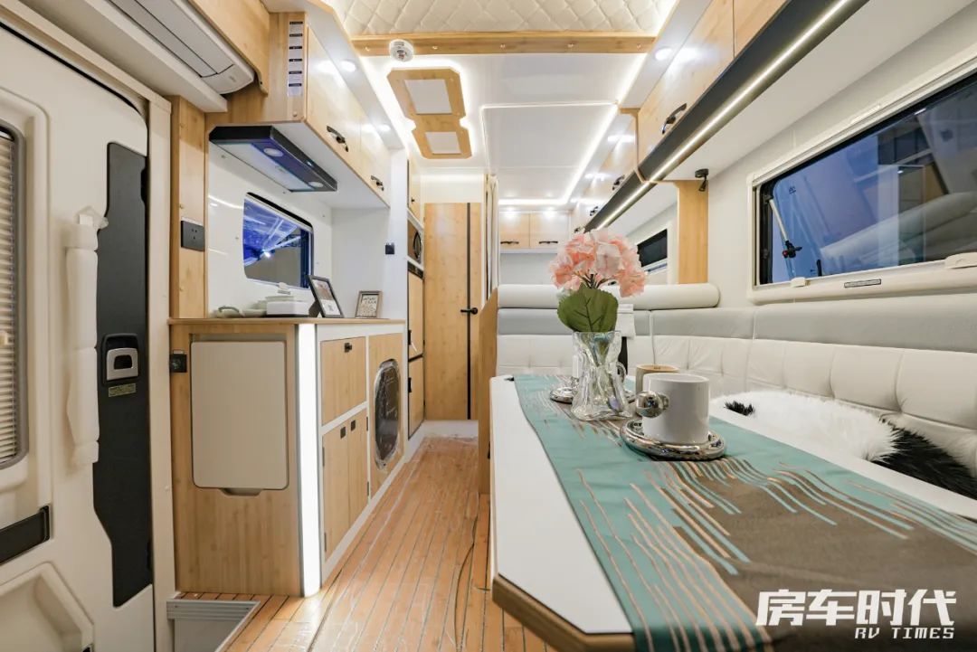 厨房区配置齐全,车内厨房配备内嵌式电磁炉吸油烟机、组合式橱柜,同时洗菜池下方内嵌有一台洗衣机。会客区后方配置有一台148L超大容量冰箱,食物储存无烦恼。