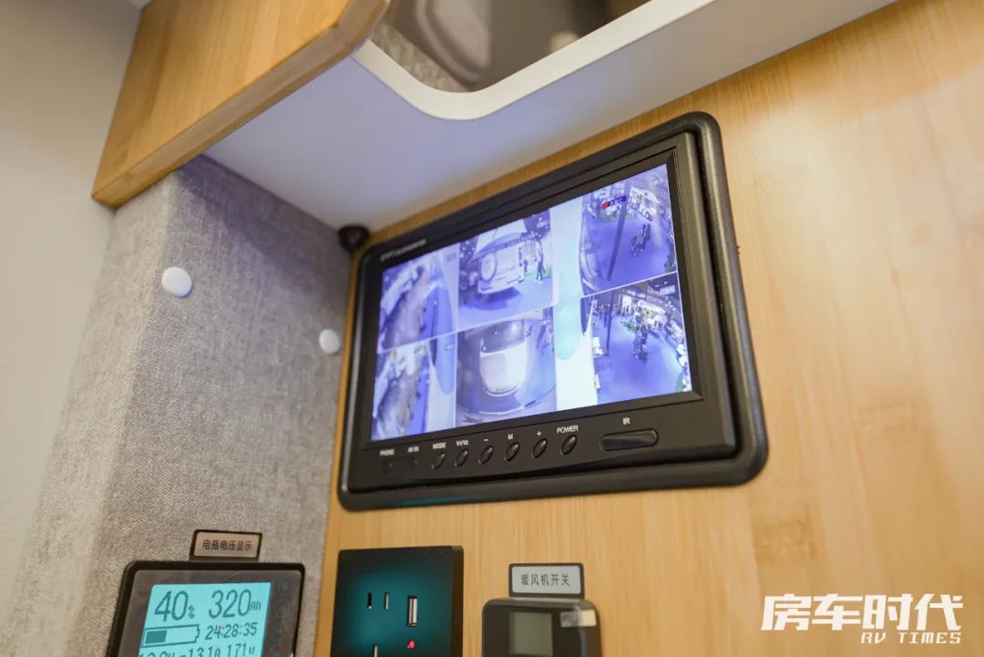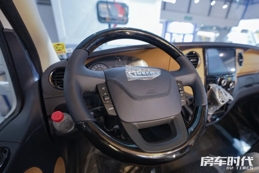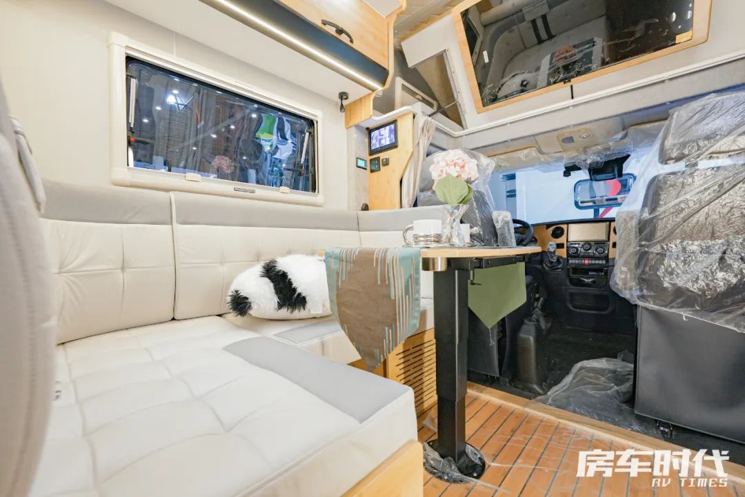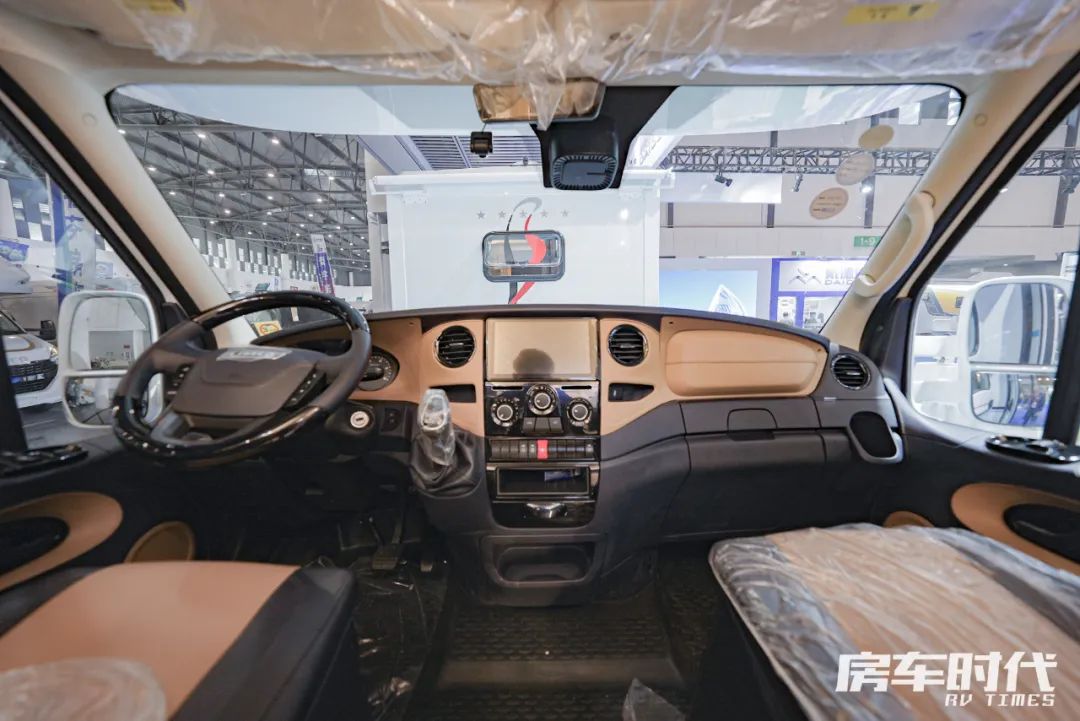 驾驶室装配有主副驾空气悬挂三向调节座椅,副驾驶座椅可以向后旋转,区域内配备有多功能方向盘、原车中控屏、车机手机互联和GPS导航、电动加热加宽外后视镜、定速巡航、车载液晶屏、倒车雷达、倒车影像、胎压监测等,保障行车安全,整个驾驶室与生活区没有高差,前后走动更加舒适便捷。