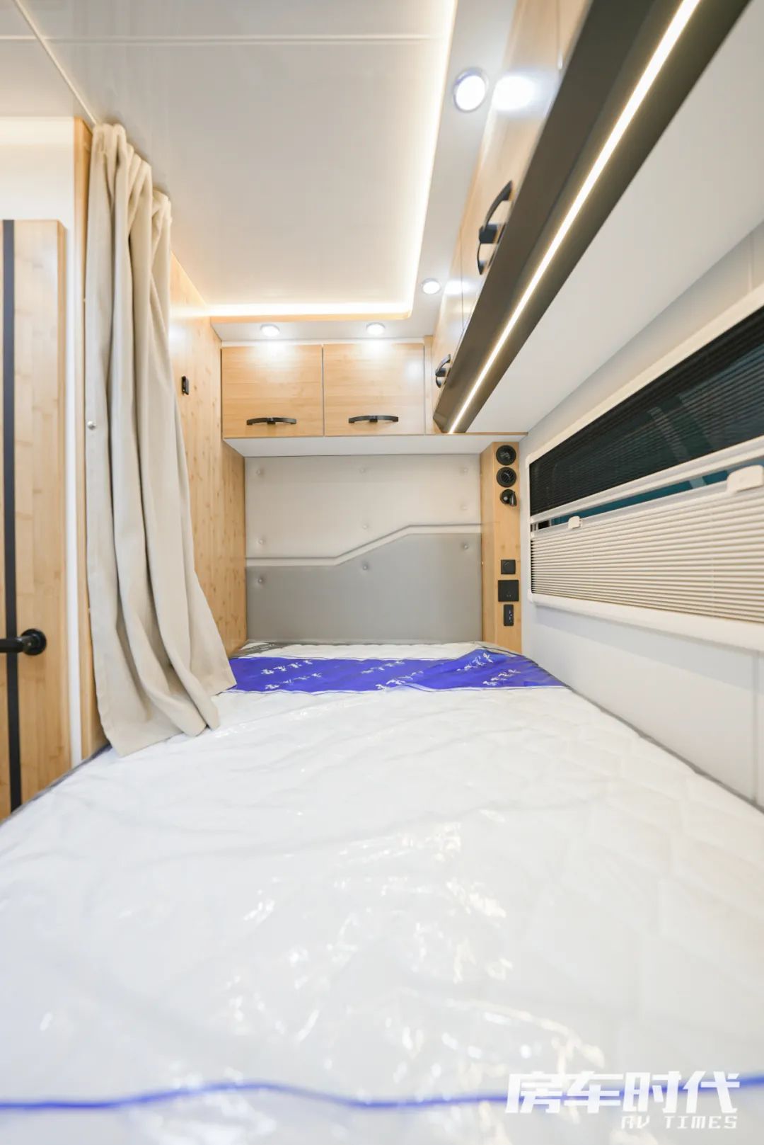 除了会客区拼床外,车内还有另一个睡卧空间——尾置纵床,尺寸为1200×1900mm,整体采用了乳胶复合床垫组合吊柜,床铺侧面设计有外推窗、布艺隐私帘、阅读灯以及电源接口,保障睡卧舒适性。顶部做了吊柜的设计,便于收纳床品衣物。