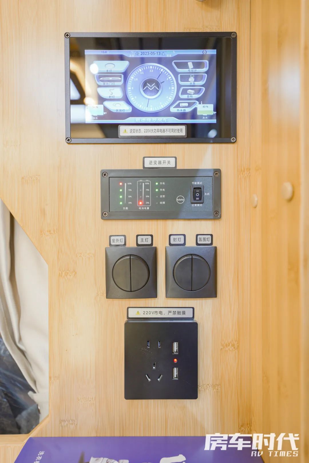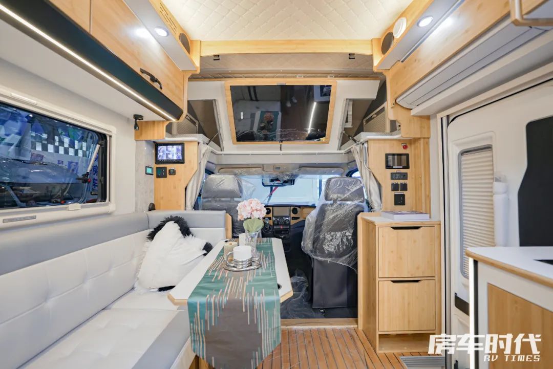 全车内饰采用了竹木家具日式工艺打造,将传统材料与现代新工艺、新技术相融合,既透着自然的古朴气息又不失现代的时尚元素,家具造型设计简洁,通过精巧的布局,彰显竹木的气息。内饰布局从前到后依次为驾驶室+额头床、中置“L”型会客区、厨房区、后置纵床+卫浴间。
