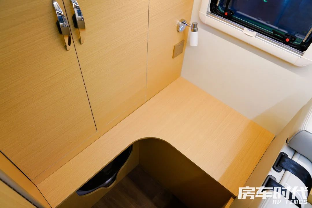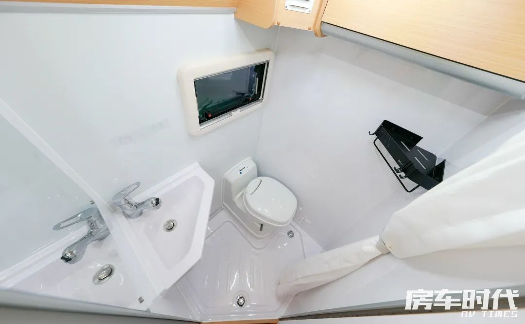 卫生间采用一体式设计,内部配备荷兰塞特福德马桶、淋浴花洒、洗手池、梳妆镜等,为车友提供全方位的卫生间使用体验,乘客在行车途中也能够享受到家的温馨与舒适。