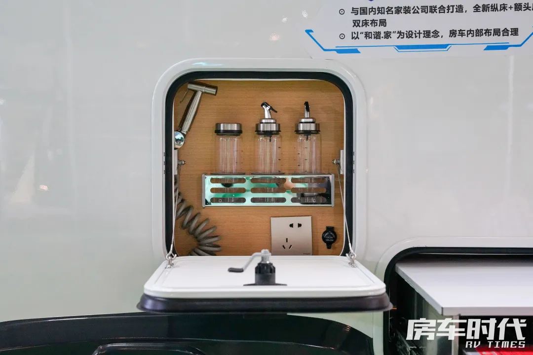 水路系统方面,标配160L清水箱(可选配300L+直饮水系统)+50L灰水箱。电力系统方面,配有12V+48V双电源系统、800W太阳能、10度锂电+车规级5kW充逆一体机(5kW逆变器3.3kW充电机)+多功能市电充电口+电路保护装置等。
