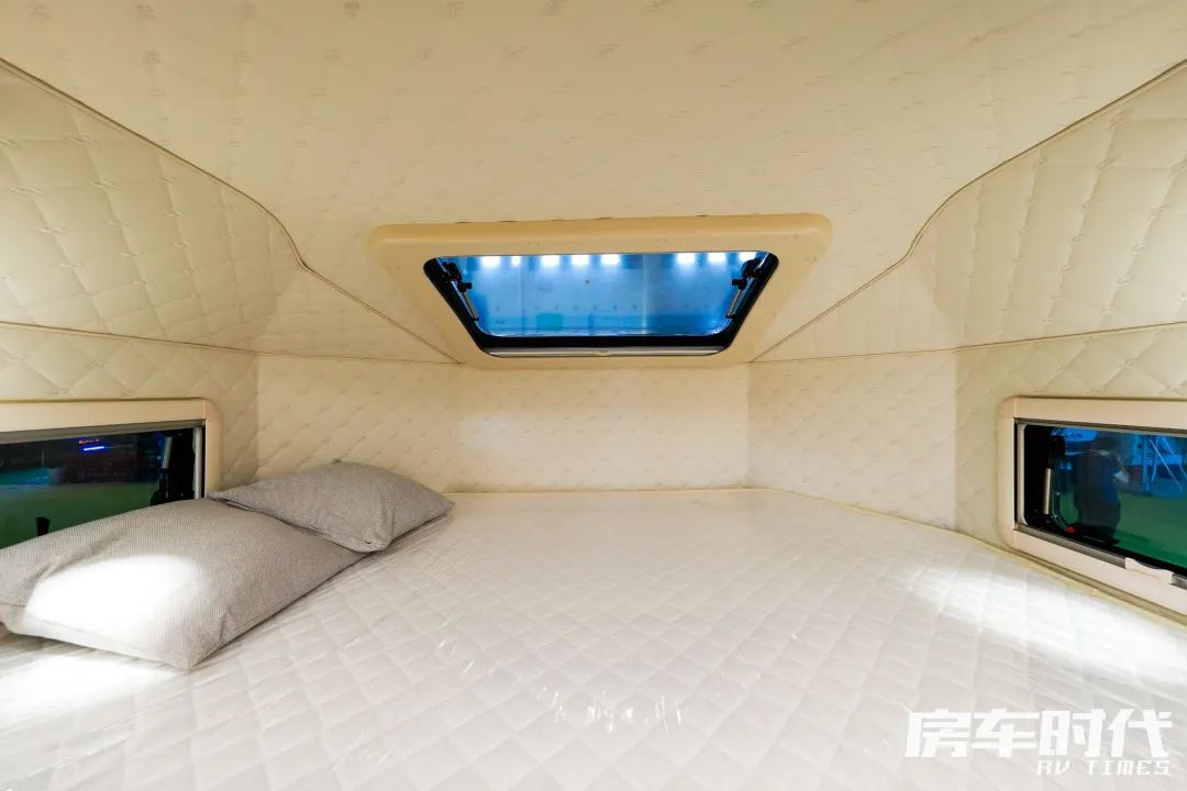 驾驶室上方配有额头床,尺寸宽阔容纳双人休憩不是问题。床铺三面环窗,通风换气的同时能为车内带来明亮光线。空间内部通透明亮,让车友可以更好地欣赏自然景色。