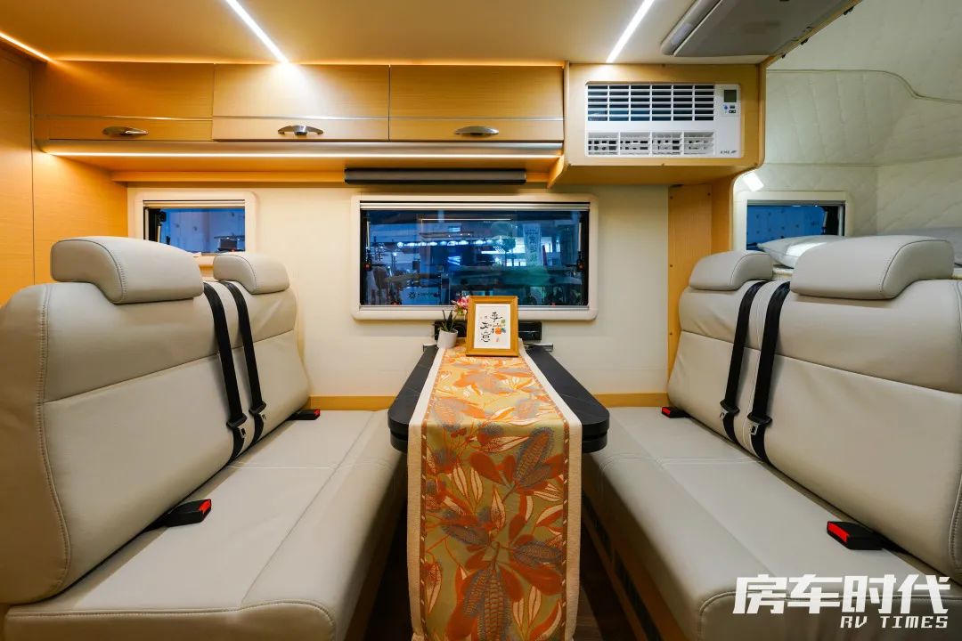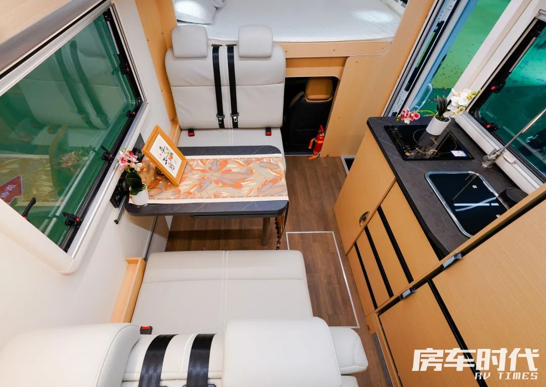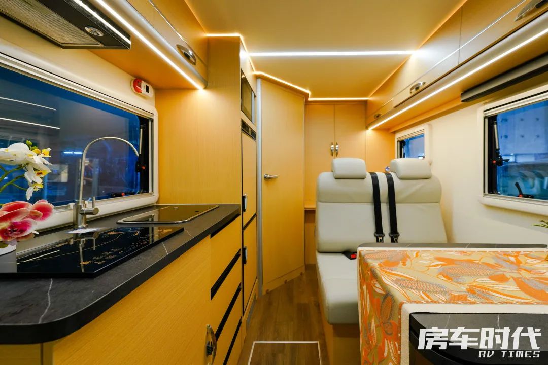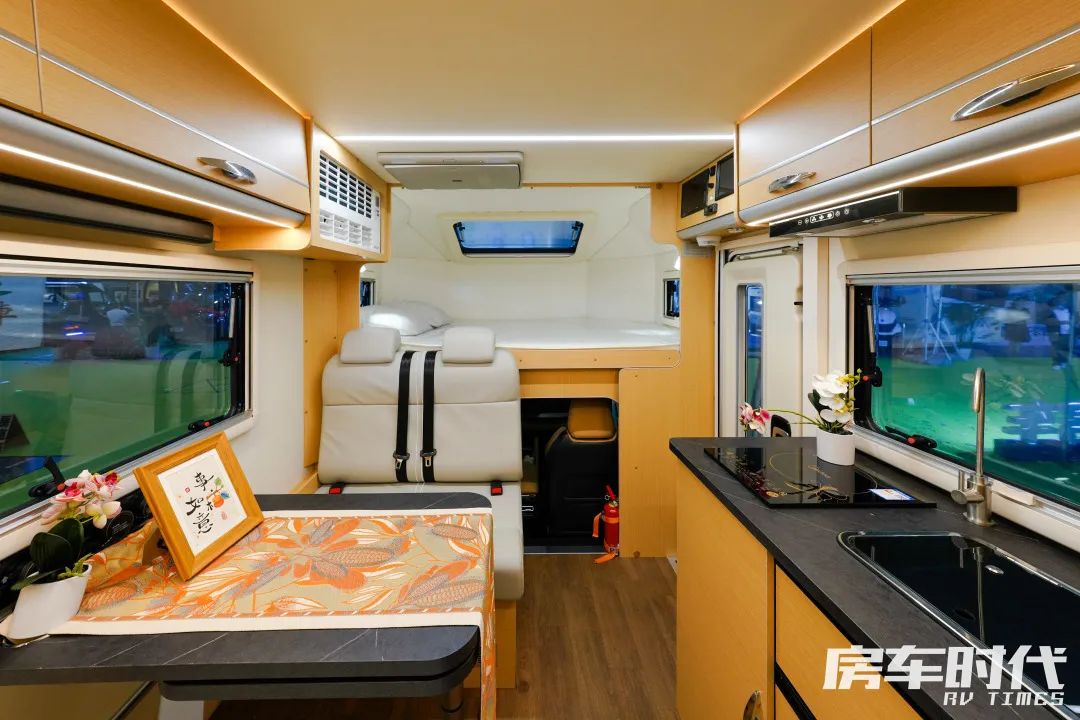 进入车内,家具以原木色和米白为主,搭配顶部暖色灯光,塑造出明亮温馨的氛围。房车内饰布局有一点特别,并没有采用常规的C型房车布局,前方为驾驶室、额头床,中部为会客区、厨房区,尾部为卫生间,并且旁侧这款车还特意设计了“DIY”区域,增加旅途的乐趣。
