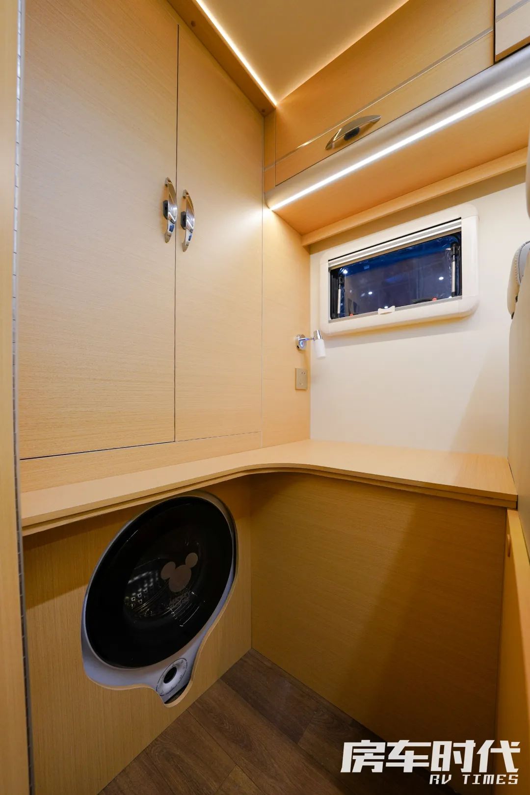 会客区后方则是厂家特别设计的“DIY”区域,这里设计了立式衣柜方便悬挂旅途所需衣物。这里还设计了一个呈L型的小型桌面,配有阅读灯,这里可以成为儿童的小书桌,也可以成为日用物品的摆件区,增添满满的生活气息。车友可以根据自己的需要将这款DIY区域进行定义。桌面下方配有洗衣机,解放双手。