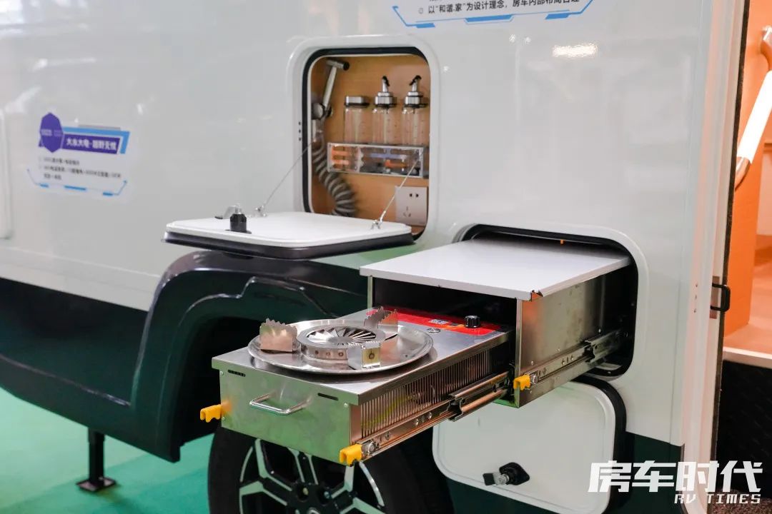车侧除了常规的遮阳棚、注水口、充电口等配置,车侧还配有抽拉式炉灶和翻折盖板。炉灶设计考虑到了人体工程学的要求,高度设计得宜,即使身高一米八的成年人烹饪时也无需弯腰,进一步增加了用户的使用舒适度和便利性。