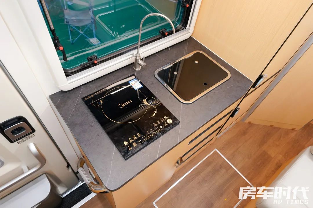 尾部厨房区设有洗菜池、微波炉、储物柜等,料理台下方配有储物柜方便收纳厨房用品。烹饪区正好正对窗户,方便通风,可以避免室内沾染烹饪所产生油烟。在厨房区一侧还配有车载冰箱,满足车友在旅程中提供食物储存需求。