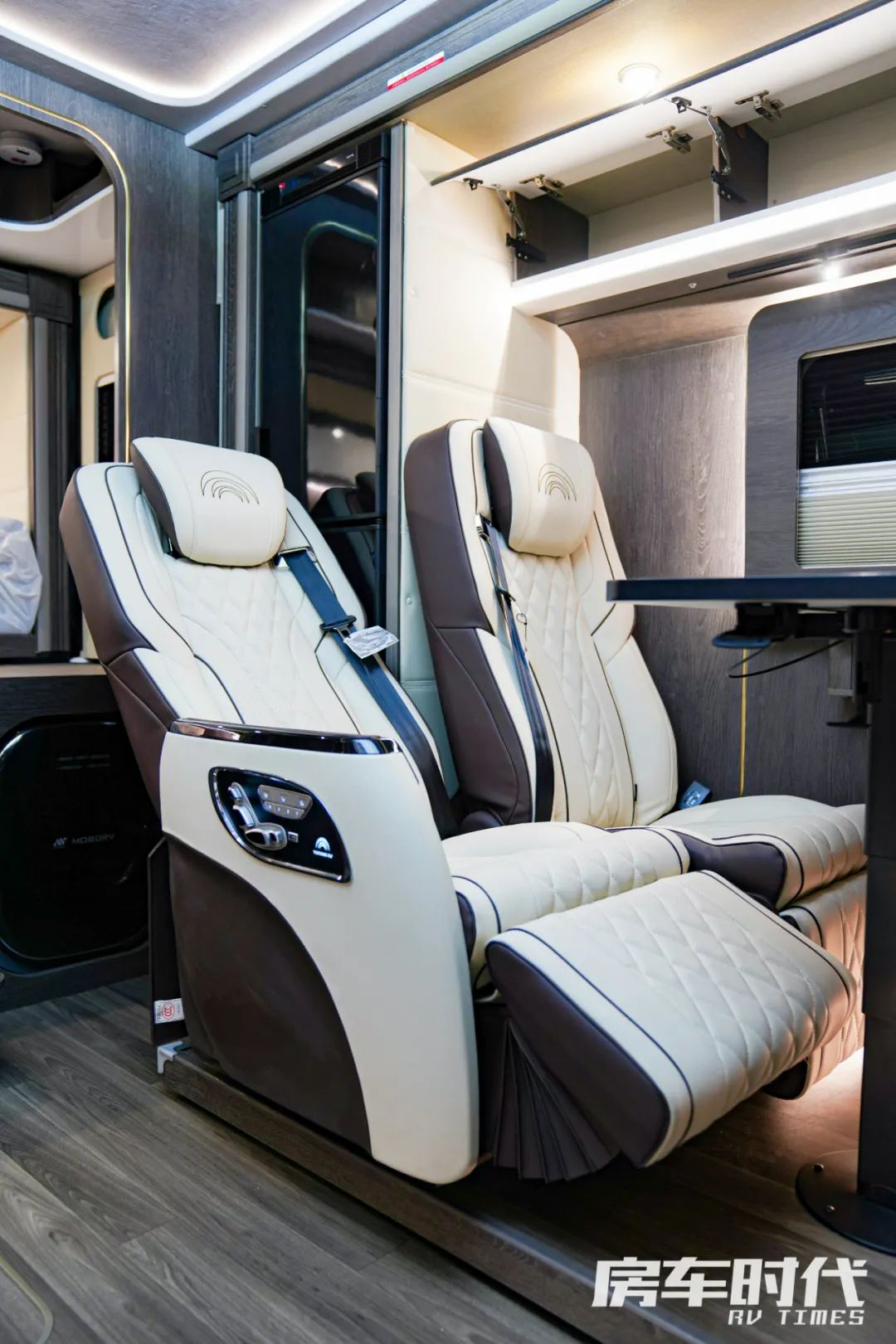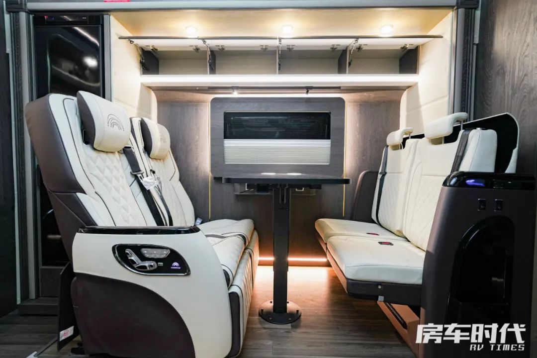 座椅中间的餐桌为可调节设计,带四向滑移、气动升降功能,区域内设有水杯托、无线充电区、220V插座,台面下方为储物格。