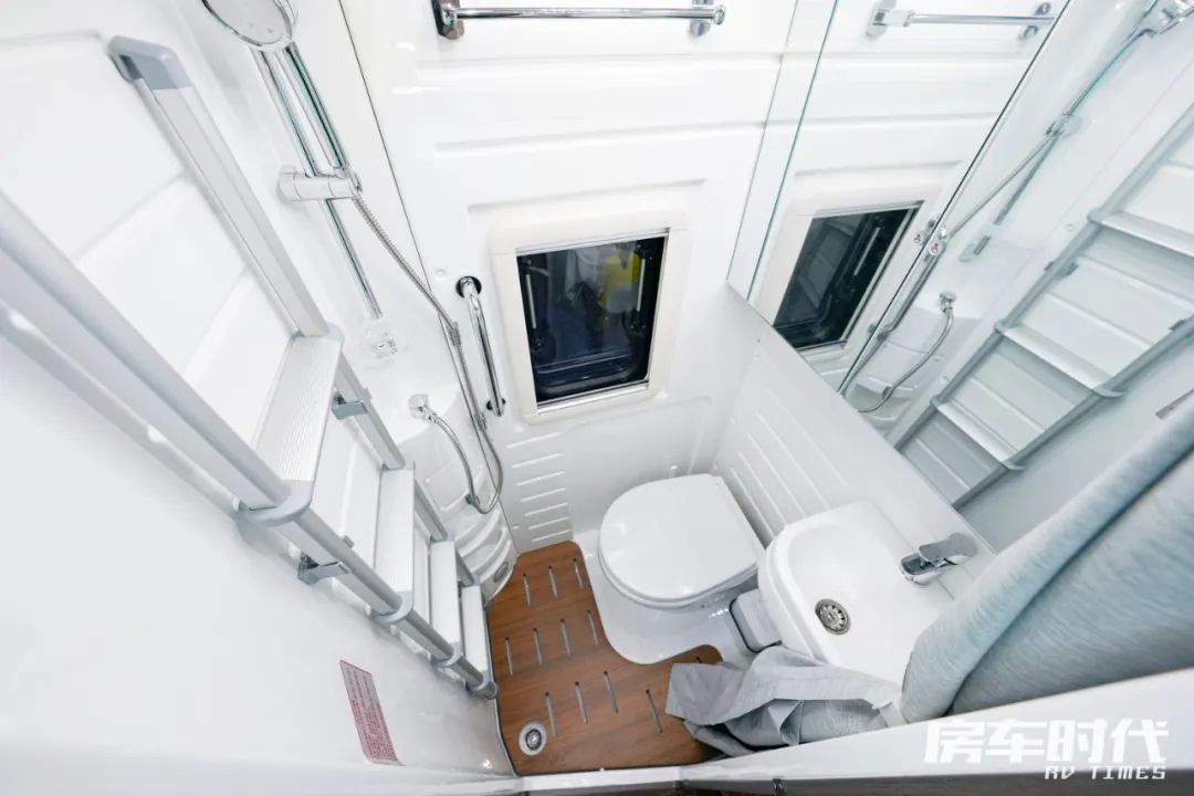 驾驶室上方为额头床,床铺空间宽裕,足够两个成年人睡卧使用,标配有45D床垫,舒适性有保障,设计有可移动爬梯以及上下床扶手,安全贴心。驾驶室设计有私密拉帘,休息时将拉帘关闭可以保障后方生活区的隐私。影视娱乐方面,车辆内部配置有一台40英寸互联网液晶电视,生活区配置4个扬声器。