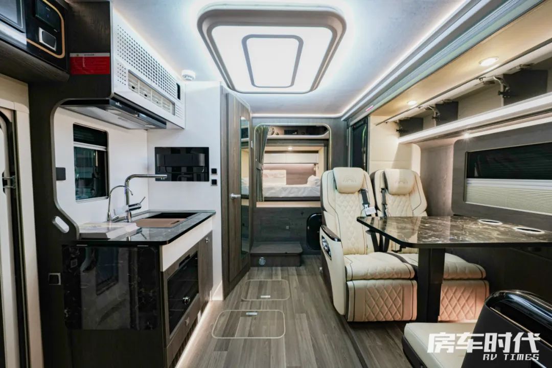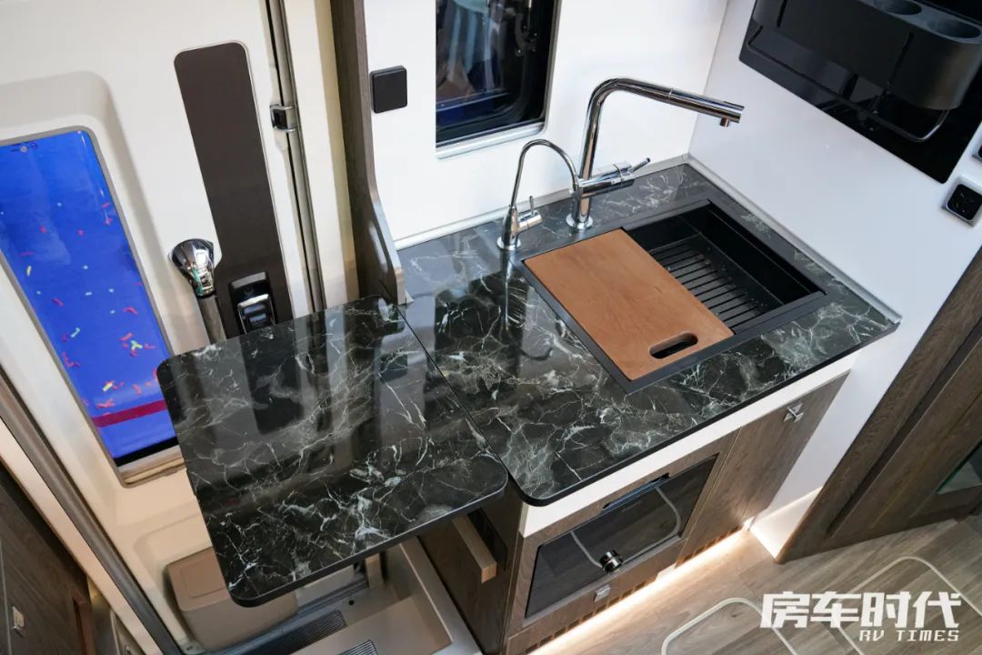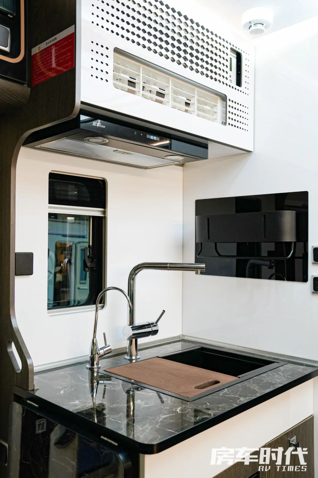 厨房区位于车门一侧,台面上配备有洗菜池、高脚水龙头,区域内配备有蒸烤一体机、便携式家用电磁炉、侧排抽油烟机、电源接口等。
