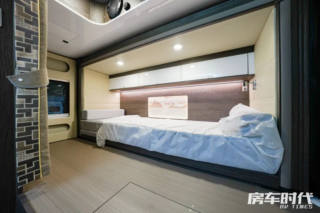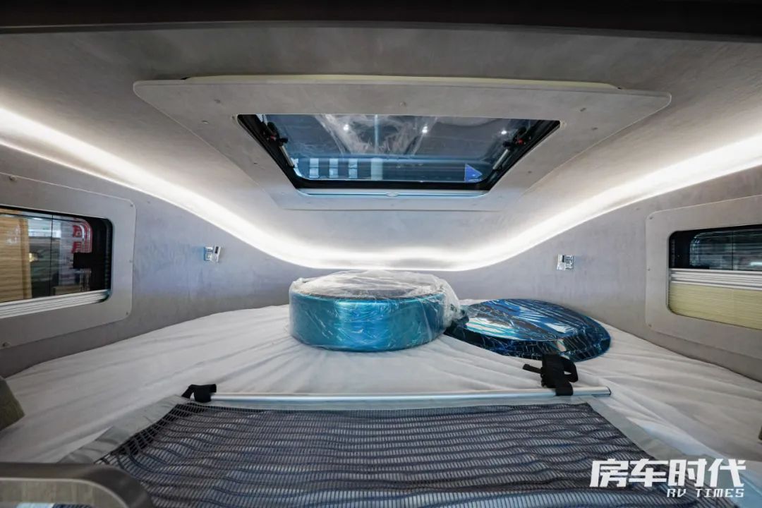 车尾为整车的固定睡卧横床,铺设有45D床垫,将尾部的拓展舱展开后,床铺空间可供两人睡卧使用。周围设计有床帘,睡卧空间更加有私密性,顶部做了储物吊柜的设计,便于储放床品衣物。