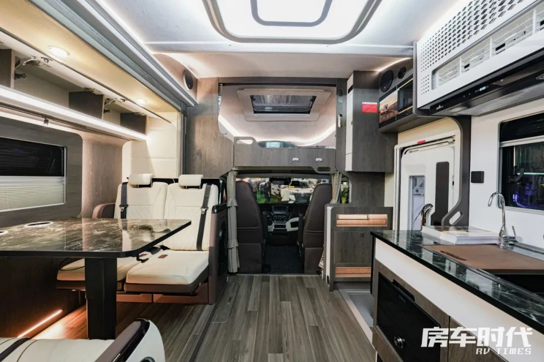 外观方面,飘逸的橙色拉花时尚感十足,车辆整体采用了高保温铝骨架+PVC墙体,房车配备有带纱窗中控乘客门、乘客门电动踏步、司机门固定踏步、进口电动遮阳棚、带风感、无支腿,车辆顶部为全景式天窗设计,为车内带来了充足的自然光线。车辆尾部为贯通式储物舱,车内床铺下开门,便于车内拿取行李物品。